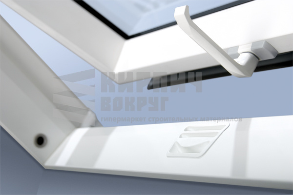 Ручка белого цвета, расположенная в нижней части оконной створки, позволяет легко открывать и закрывать окно, а также фиксировать его в 2-х положениях проветривания;