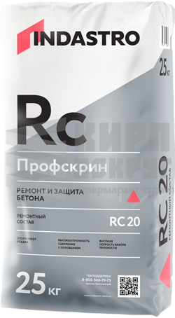 ОПИСАНИЕ Ремонтный состав Профскрин RC20 – готовая к применению сухая смесь изготовленная на основе портландцемента, фракционированного песка и модифицирующих добавок. После затворения водой образуется тиксотропный раствор для ручного нанесения. Подходит для нанесения на вертикальные и потолочные поверхности. Продукция экологически безопасна и не содержит вредных примесей, оказывающих отрицательное воздействие на здоровье человека. Соответствует действующим на территории Российской Федерации санитарногигиеническим нормам. ОБЛАСТЬ ПРИМЕНЕНИЯ Ремонтный состав RC 20 применяется для восстановления геометрии бетонных конструкций: фасады зданий кромки и углы балконов откосы ремонт вертикальных и горизонтальных площадей, а также потолков ступени лестниц СРОК ГОДНОСТИ Срок хранения в сухом помещении в заводской упаковке составляет 12 месяцев от даты изготовления. ИНСТРУКЦИЯ ПО ПРИМЕНЕНИЮ Подготовка основания Основание должно быть чистым, прочным и способным нести нагрузку. Особо плотные, гладкие основания и не способные нести нагрузку слои (например, загрязнения, старые покрытия, пленкообразующие материалы, водоотталкивающие материалы или цементное молочко), а также повреждённые бетонные поверхности должны быть предварительно обработаны пескоструйной или водоструйной обработкой. Основание должно быть шероховатым, т.е. заполнитель должен быть отчётливо виден. Предварительно обработанное основание необходимо увлажнять в течение 3 часов. Поверхность должна быть влажной, но при этом следует избегать образования луж. Необходимо удалить все продукты коррозии с бетонного основания, а также со стальной арматуры с помощью пескоструйной установки. Для длительной защиты арматуры от коррозии необходимо нанести антикоррозионный состав Профскрин LC2.5. Для улучшения сцепления рекомендуется нанесение грунтовочного слоя из антикоррозионного Профскрин LC2.5 или ремонтного состава RC20. Для этого материалы смешивают c водой до пластичной консистенции и наносят с помощью кисти на слегка влажное основание. При этом необходимо избегать высыхания грунтовочного слоя. Приготовление раствора Для приготовления раствора содержимое мешка при постоянном перемешивании высыпать в ёмкость с чистой водой (из расчета 0,15-0,16 л/кг) и перемешать до образования однородной массы. Перемешивание производится профессиональным миксером. Замешивание материала миксерами гравитационного типа или вручную не рекомендуется. Для смешивания необходимо использовать весь мешок с материалом. Раствор необходимо выдержать 3-5 минут, а затем повторно перемешать. После этого раствор готов к применению. Материал необходимо использовать в течении 60 минут. При повышении вязкости раствора в емкости (в пределах времени жизнеспособности) необходимо тщательно перемешать его без добавления воды.Не допускать передозировку воды!!! Для приготовления раствора использовать только чистые емкости, инструменты и воду. Нанесение При выполнении работ механизированным способом необходимо сначала нанести тонкий контактный слой на подготовленное и слегка влажное основание, а затем постепенно нанести желаемую толщину. При ручном способе нанесения на подготовленную поверхность наносится раствор толщиной от 5 до 50 мм. МЕРЫ ПРЕДОСТОРОЖНОСТИ ВНИМАНИЕ!!! Смесь содержит цемен